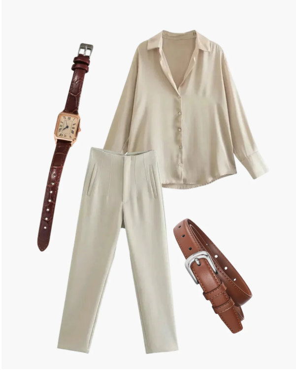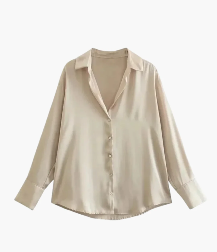 The fabric drapes naturally, reflecting light with subtle depth — never excessive, always controlled. Its texture is soft against the skin, while the cut maintains a clean, timeless form.